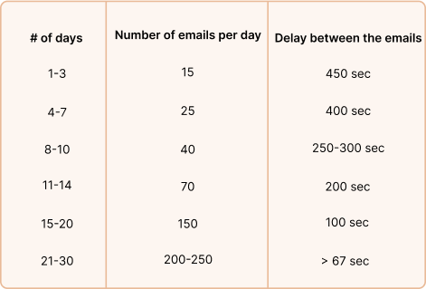 Despite the initial perception of it being time-consuming, the practice significantly reduces the time required for establishing your credibility. Manually warming up your email account necessitates a span of two to three weeks, after which you can gradually initiate sending cold emails. This involves gradually escalating the volume of emails sent every few days, as illustrated in the sample 3-day ramp-up framework provided below.